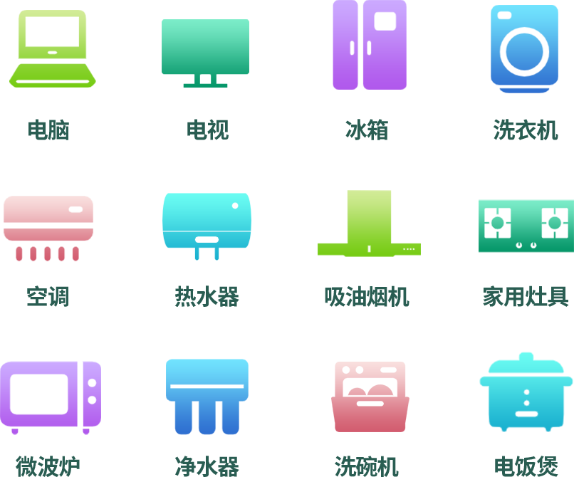 商品品类:电脑(包括台式机、笔记本电脑,不包括平板)、电视机(含投影仪)、冰箱(含冰柜)、洗衣机(含洗烘一体机)、空调(含嵌入式、家用中央空调)、热水器(含壁挂炉、小厨宝)、吸油烟机、家用灶具(含集成灶)、微波炉(含一体机)、净水器、洗碗机、电饭煲(含电压力锅)