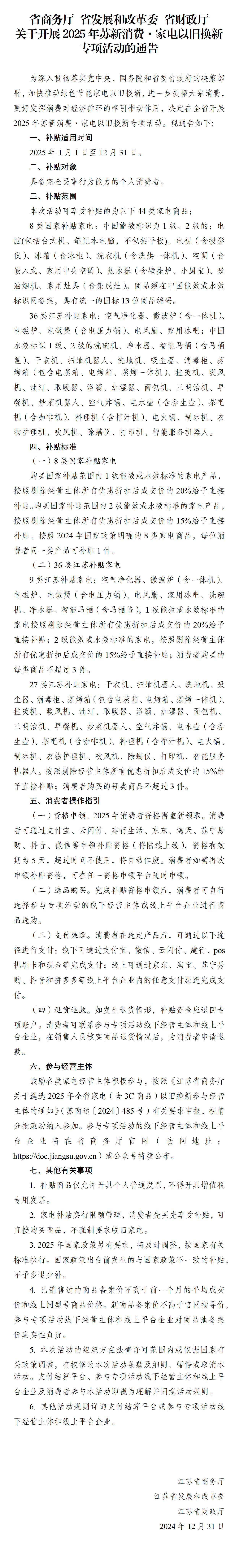 1.对于个人消费者购买一级能效或水效标准的补贴家电产品,按照剔除经营主体所有优惠折扣后成交价的20%给予直接补贴。